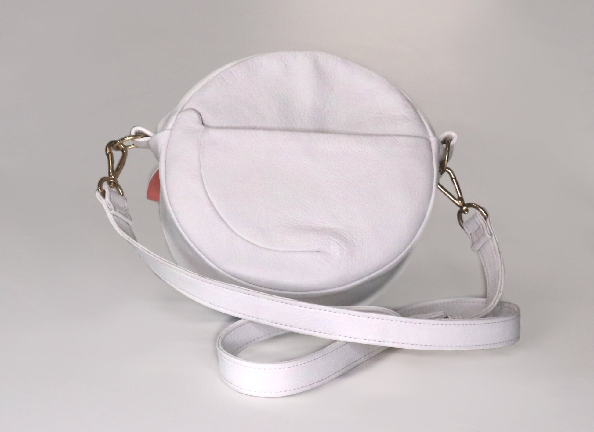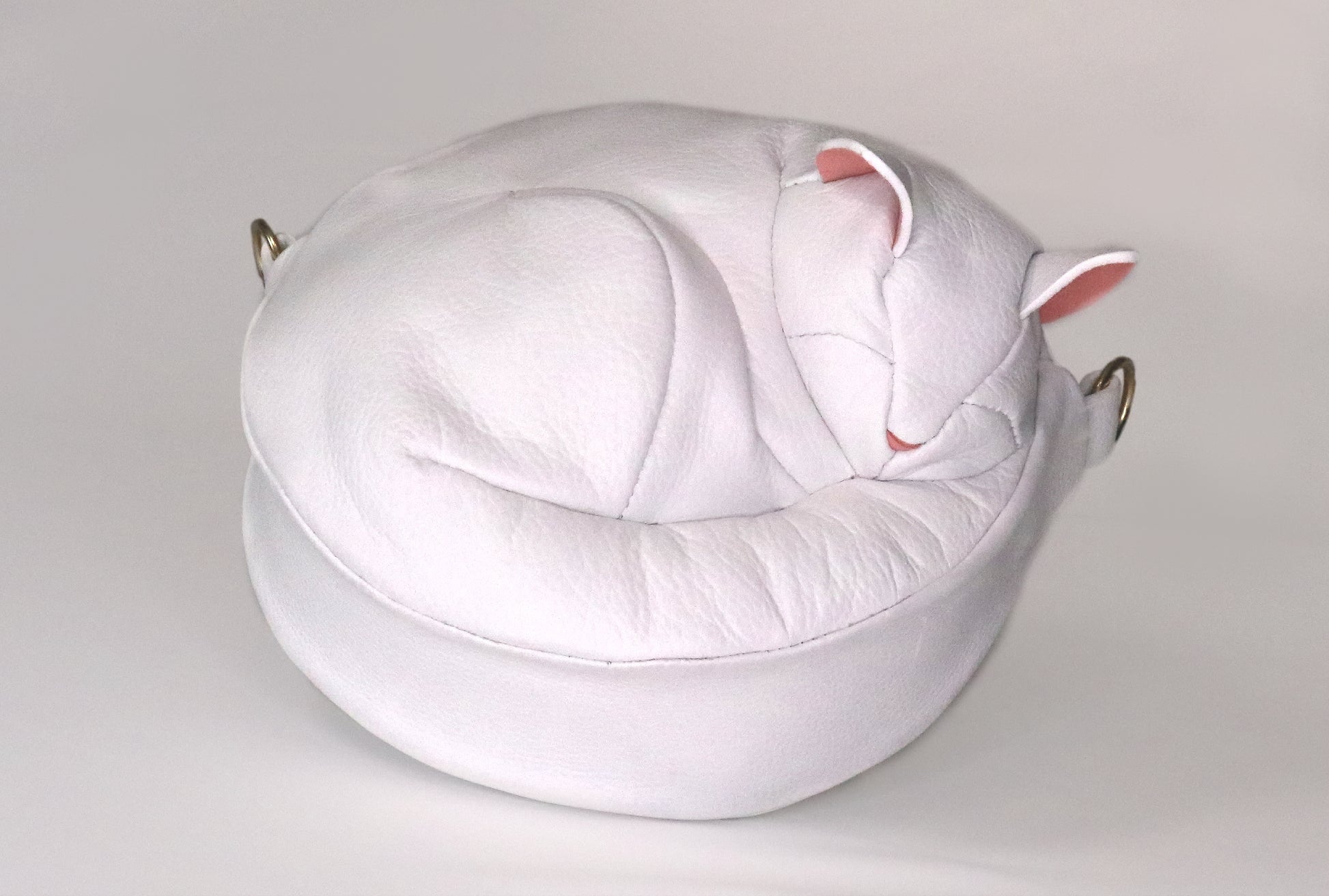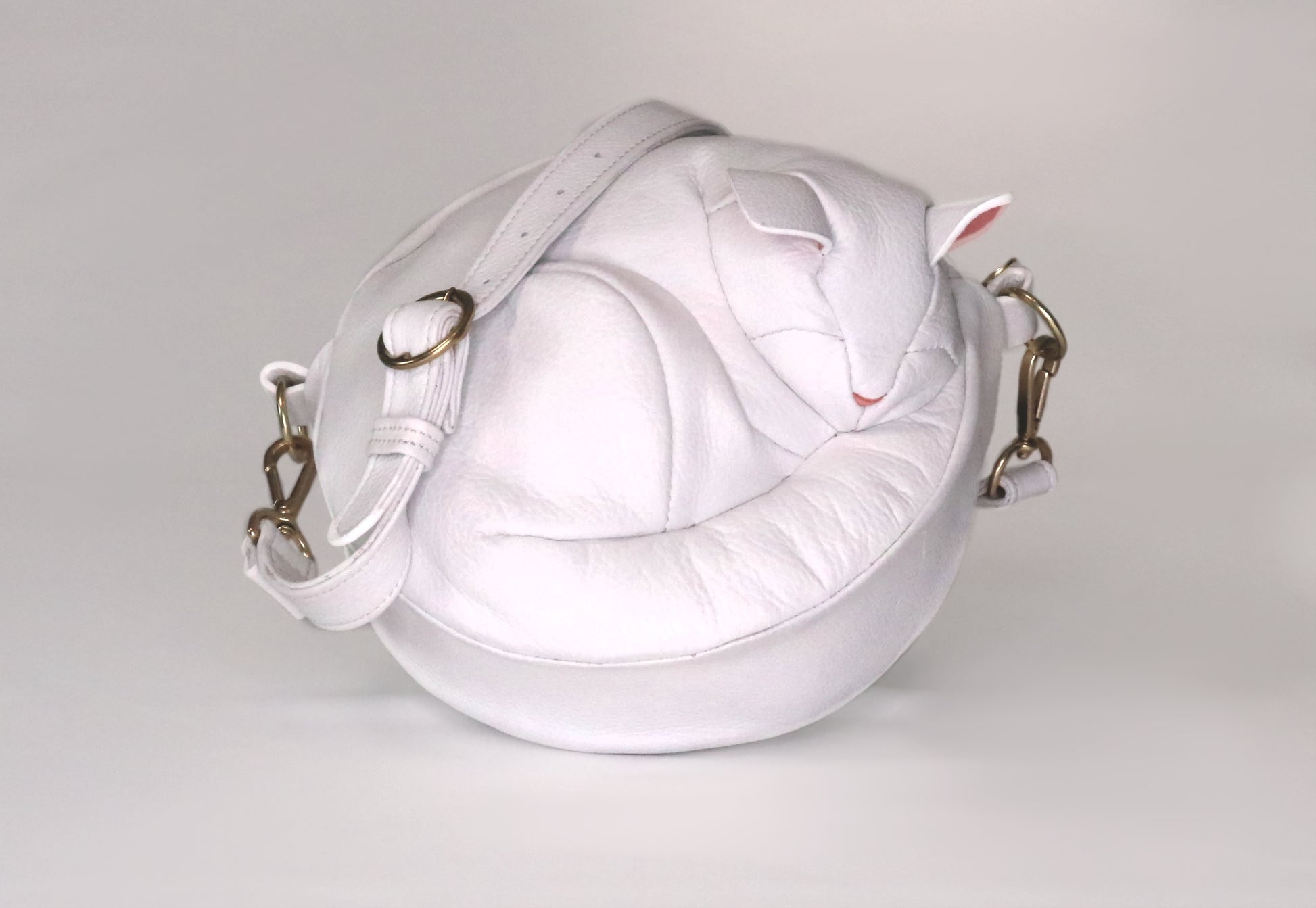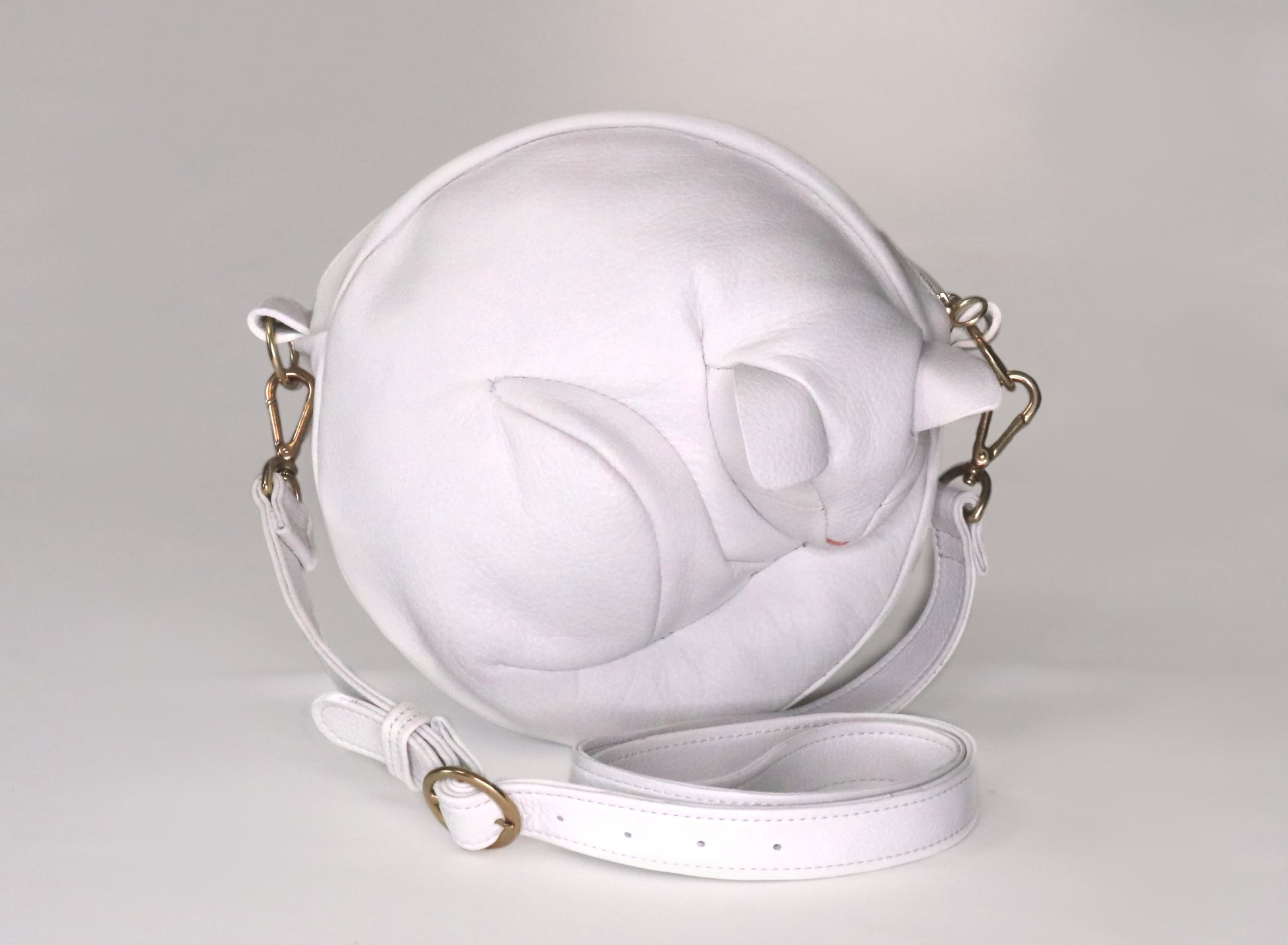 Meet Snowball, this darling crossbody bag is designed for proud cat lovers with a playful style. Handmade from premium leather with accenting suede on the nose and ears, durable solid brass hardware and top of the line Riri zippers. This snoozy cat has both exterior and interior pockets for all your belongings, including a whimsical tail pocket with magnetic closure and interior zippered pocket to stash away you cat treat! The adjustable, and fully removable, strap ensures a perfect fit, while the solid brass hardware is up to the wear of daily use. This bag isn't just a charming show piece but a functional addition to your wardrobe. Designed to turn heads and built to last, Snowball is the ultimate accessory for those who dare to stand out.